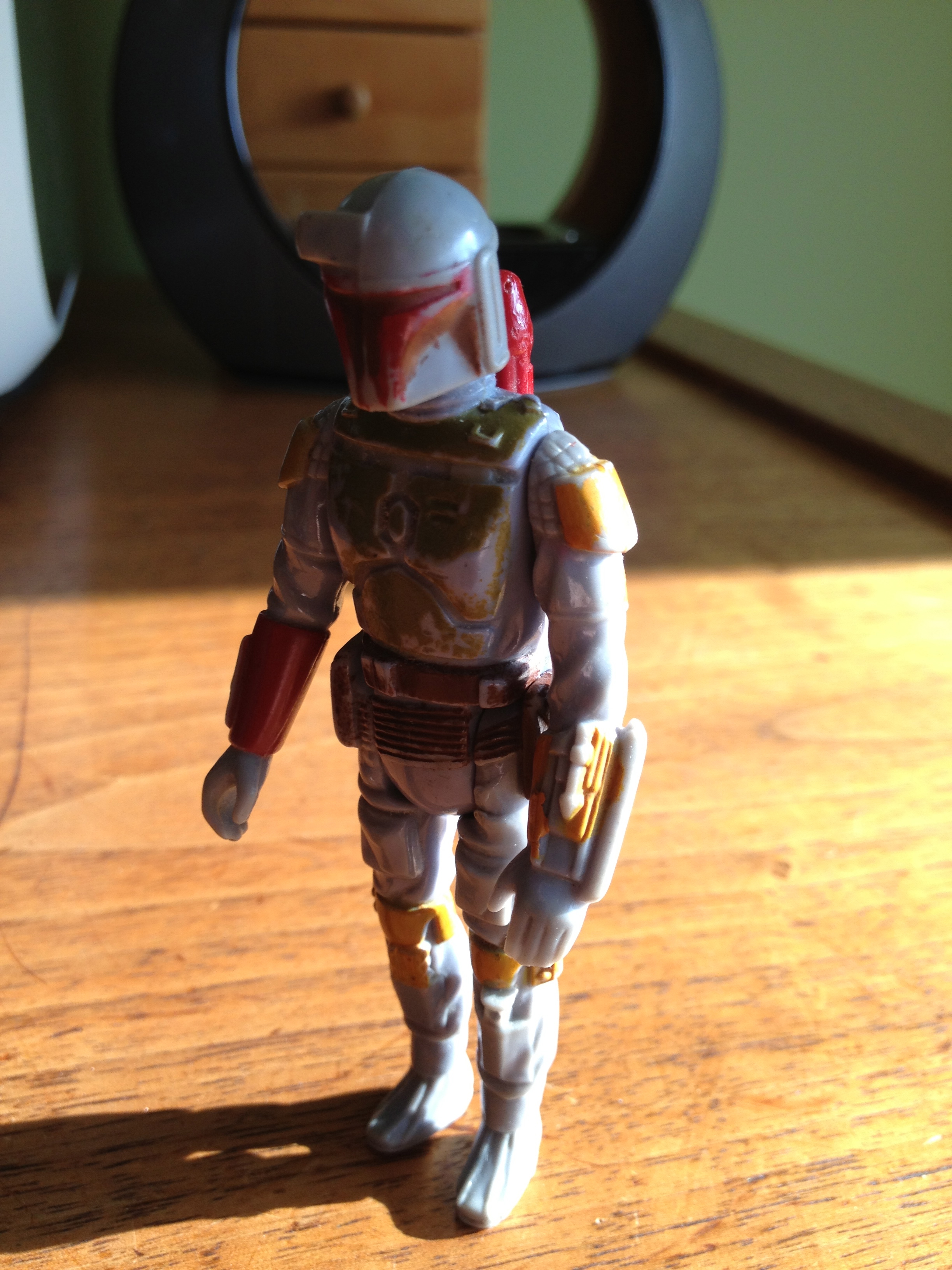 A Star Wars action figure that I had thought was lost to the sands of time, used as a dog chew or generally played with and abused by a 6-7 year old in the early 1980’s then tossed into the abyss of garage sale and second hand toys…..My original Boba Fett.