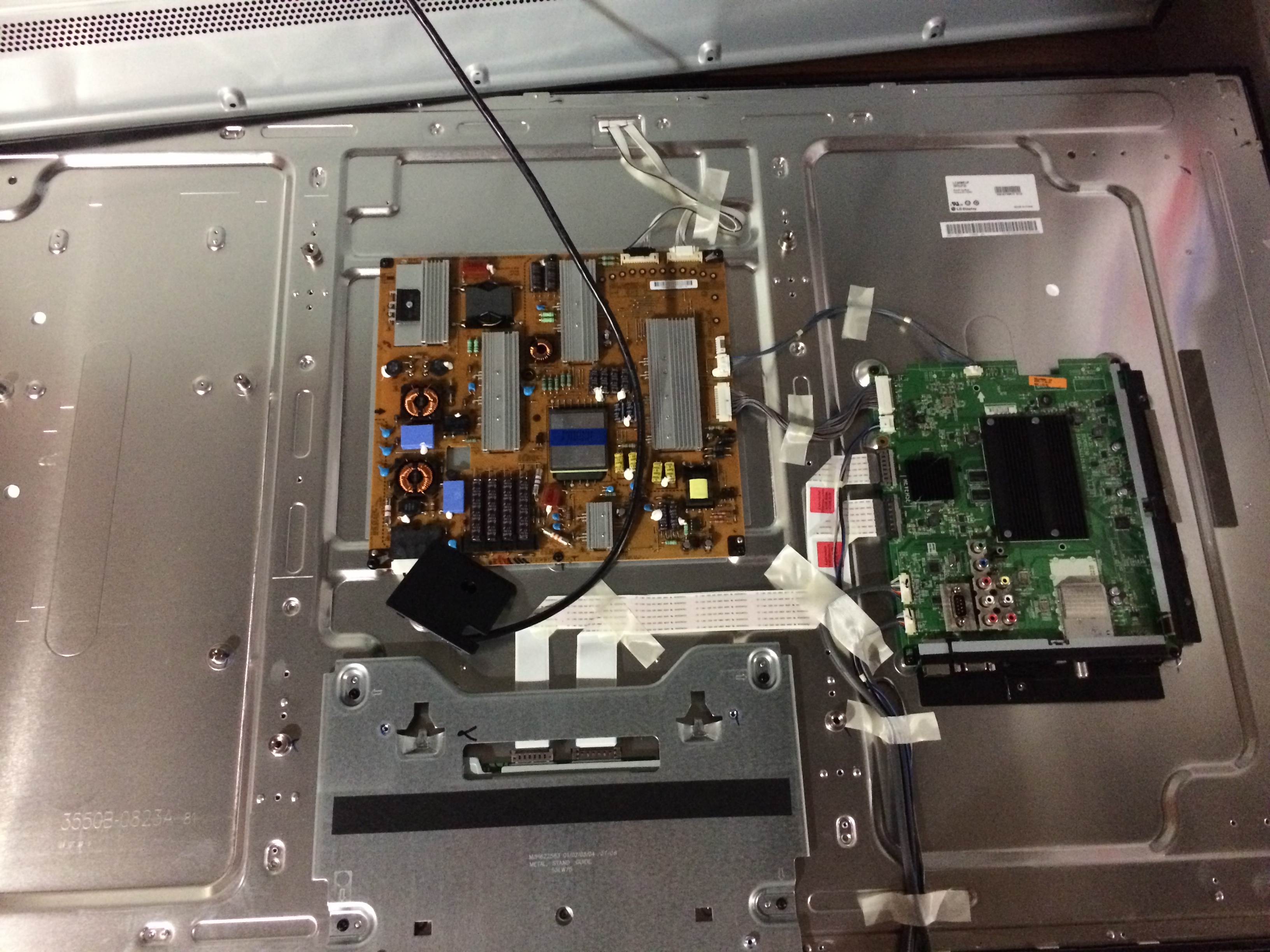 Having this history, it made me a bit disheartened when some lightning damaged a substantial set of electronics that a relative of mine had and the insurance adjuster just called it all bad and they paid for new. Now, I get it, newer electronics are more complicated and more susceptible to EMI. However, TVs in particular are really just big PCs nowadays. A power board, a motherboard and a giant LCD. That’s it. Oh, and a case and stand, neither of which is critical to the operation of the device. Knowing that, I took both broken TVs, a 55″ LG, passive 3D smart TV and a 32″ samsung and took them home along with the LG blu-ray player. My logic was that, at the very least, I could have fun showing the kids how to take them apart and we could go over the insides.